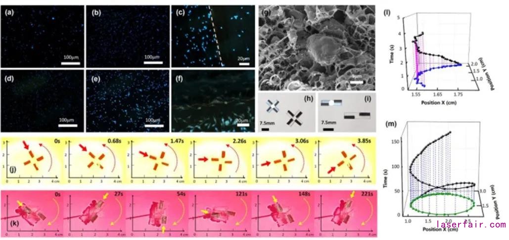 圖4.分別在LIG致動(dòng)器上培養(yǎng)a)24小時(shí)和b)48小時(shí)的MDA-MB-231細(xì)胞的熒光顯微鏡圖像。c)LIG和PI膠帶連接處細(xì)胞數(shù)量的熒光顯微鏡圖像。d-e)白熾燈照射前后細(xì)胞形態(tài)的熒光顯微鏡圖像。f)連續(xù)光照下細(xì)胞形態(tài)的熒光顯微鏡圖像。g)附著在LIG表面的單個(gè)細(xì)胞的掃描電鏡圖像。h)十字形集成致動(dòng)器和I)矩形集成致動(dòng)器的光學(xué)照片。j)十字形集成致動(dòng)器的旋轉(zhuǎn)運(yùn)動(dòng)的視頻截圖。l)從相應(yīng)的視頻中提取的對應(yīng)運(yùn)動(dòng)軌跡圖。k)矩形集成致動(dòng)器的旋轉(zhuǎn)運(yùn)動(dòng)視頻截圖。m)從相應(yīng)視頻中提取的對應(yīng)運(yùn)動(dòng)軌跡圖。