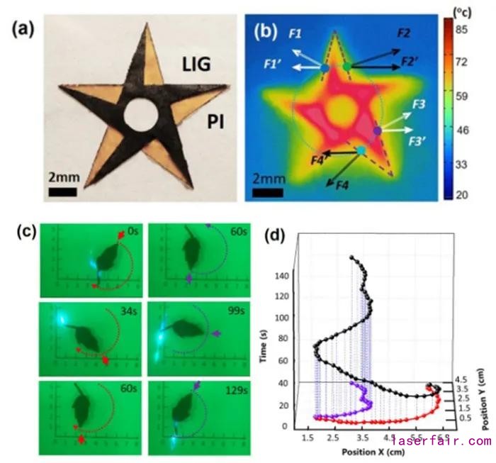 圖2.a)LIG圖案化五角星形致動(dòng)器的照片。b)白熾燈照射下五角星形致動(dòng)器的熱像圖。c)集成有LIG標(biāo)簽的葉片致動(dòng)器的旋轉(zhuǎn)運(yùn)動(dòng)。d)從相對應(yīng)的視頻中提取的葉子致動(dòng)器旋轉(zhuǎn)的運(yùn)動(dòng)軌跡圖。