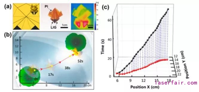 圖3.a)3D仿生青蛙的折紙模板、集成兩條LIG腿的致動(dòng)器的光學(xué)照片和熱成像圖像。b)在聚焦陽光照射下的青蛙致動(dòng)器的直線性運(yùn)動(dòng)的視頻截圖。c)從相對應(yīng)的視頻中提取的運(yùn)動(dòng)軌跡圖。
