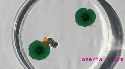 值得一提的是基于LIG膠帶的光熱Marangoni致動(dòng)器具有非常優(yōu)異的生物相容性,這一點(diǎn)已被人類乳腺癌細(xì)胞MDA-MB-231的培養(yǎng)增殖實(shí)驗(yàn)所證實(shí)。如圖4a-g所示該類型細(xì)胞可以在LIG集成化的Marangoni致動(dòng)器表面成功存活并且進(jìn)行了繁殖。LIG集成化的PDMS十字形和矩形致動(dòng)器的運(yùn)動(dòng)證實(shí)了細(xì)胞的存在不會(huì)妨礙對在培養(yǎng)基中的致動(dòng)器的運(yùn)動(dòng)操控,在陽光和白熾燈的照射下均可實(shí)現(xiàn)光能和機(jī)械能的轉(zhuǎn)換(圖4h-m)。作為粘貼式光熱標(biāo)簽,LIG膠帶可集成化的功能為基于Marangoni效應(yīng)開發(fā)致動(dòng)器和機(jī)器人開辟了一條新的途徑,這一研究策略在微流體和生物醫(yī)學(xué)工程中顯示出了的巨大應(yīng)用潛力。