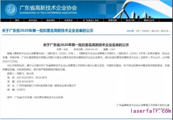 全國(guó)高新技術(shù)企業(yè)認(rèn)定管理工作領(lǐng)導(dǎo)小組辦公室2020年12月1日在廣東省科學(xué)技術(shù)廳官網(wǎng)關(guān)于公示廣東省2020年第一批擬認(rèn)定高新技術(shù)企業(yè)名單的通知:根據(jù)《高新技術(shù)企業(yè)認(rèn)定管理辦法》(國(guó)科發(fā)火〔2016〕32號(hào))和《高新技術(shù)企業(yè)認(rèn)定管理工作指引》(國(guó)科發(fā)火〔2016〕195號(hào))有關(guān)規(guī)定,現(xiàn)將廣東省2020年第一批3507家企業(yè)擬認(rèn)定高新技術(shù)企業(yè)名單(詳見附件)予以公示;公示信息中序號(hào)“230-東莞德爾激光科技有限公司”,不負(fù)眾望,這是我們?cè)俅卧谧灾餮邪l(fā),只做創(chuàng)新的有力見證。