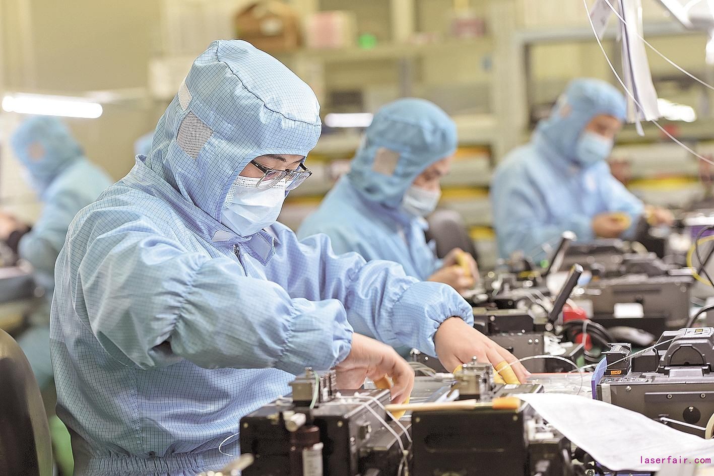 武漢銳科光纖激光技術(shù)股份有限公司脈沖光學(xué)車間一派繁忙景象,員工正在加緊生產(chǎn)光纖激光器光學(xué)模塊。