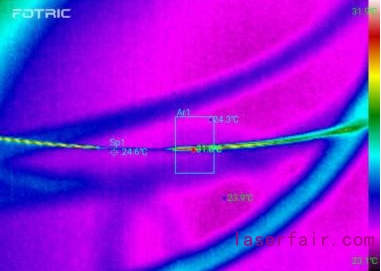 光纖會吸收部分激光能量引發(fā)溫升,溫度過高會加速老化,導致溫度高→老化加快→溫度更高的惡性循環(huán),降低激光器的可靠性和使用壽命,因此需使用紅外熱像儀檢測整段光纖,尤其是光纖熔接點溫度。