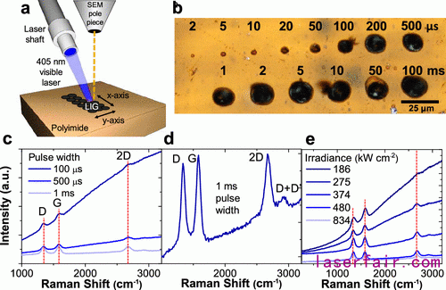 圖解:(a) 采用405 nm的激光設備安裝在大角度端口的掃描電鏡上的實驗裝置的示意圖。激光誘導石墨烯在掃描電鏡室中原位生成。 (b)激光誘導石墨烯在405 nm波長的激光,脈沖寬度從2 μs 到100 ms 變化時得到的光學顯微鏡觀察結果。 (c) 在能量為834 kW cm–2,脈沖寬度大于100 μs的時候,激光誘導石墨烯形成的拉曼光譜 。 (d)在脈沖寬度為1 ms時得到的激光誘導石墨烯的拉曼光譜的重新標度 。 (e) 激光發(fā)射時固定脈沖寬度為 100 μs時激光誘導石墨烯所形成的拉曼光譜。