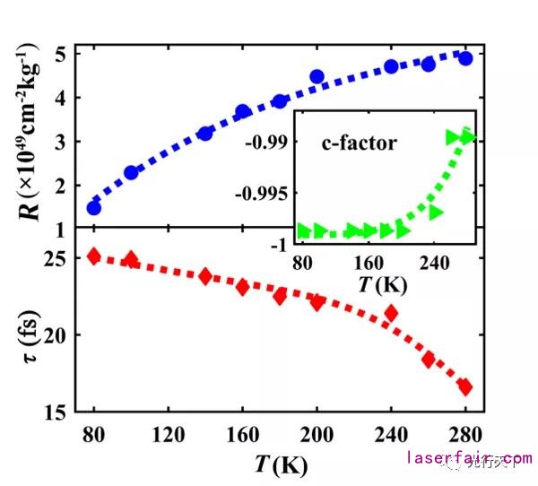 圖3.藍(lán)色碳量子點(diǎn)的載流子濃度相關(guān)參數(shù)R、馳豫時(shí)間τ及局域化因子c隨溫度變化的實(shí)驗(yàn)數(shù)據(jù)(點(diǎn))及其擬合曲線(xiàn)(虛線(xiàn))