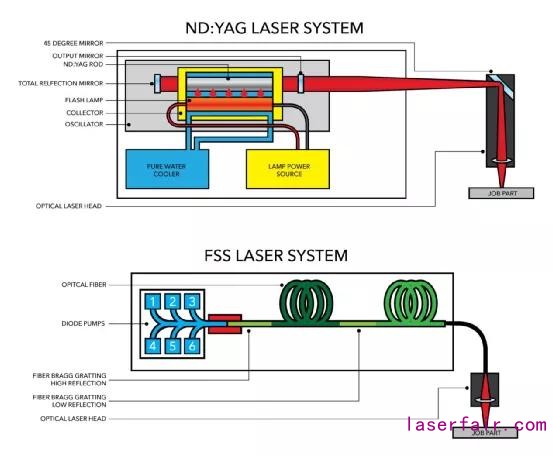 圖1 (上)Nd:YAG和(下)光纖激光器的構(gòu)造對(duì)比
