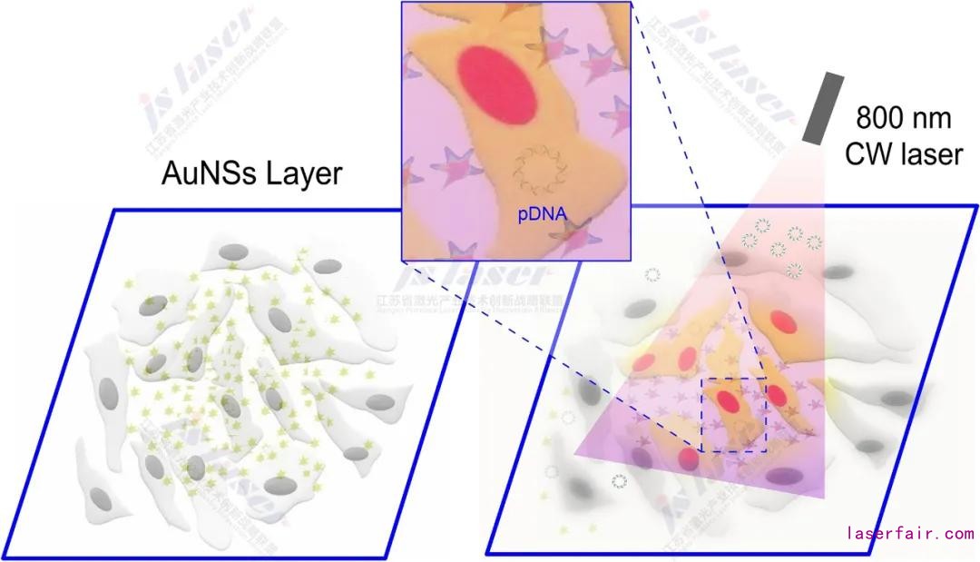 圖4 一個(gè)以AuNS層為介導(dǎo)的等離子體光穿孔平臺(tái)在激光輻照的前提下用于生物分子的輸送輸送至粘附細(xì)胞