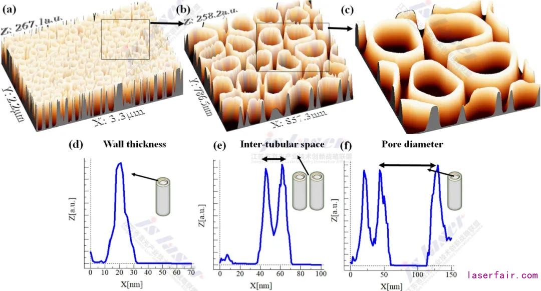 圖3 氧化鈦納米管在15 V@2 h的條件下形成的3D圖 (a-c) 和 2D (d-f) 圖