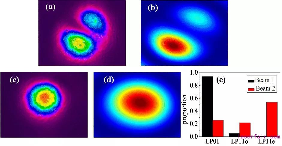 在本項(xiàng)工作中,研究人員首先對(duì)主放大器的增益光纖進(jìn)行盤繞限模優(yōu)化,增加除LP01和LP11以外的高階模的損耗,實(shí)現(xiàn)1.4 kW窄線寬少模激光輸出。然后,以高功率光纖激光器輸出的LP01和LP11模式的強(qiáng)度分布特征為基礎(chǔ),通過探測(cè)光斑的中心光強(qiáng)變化作為系統(tǒng)的評(píng)價(jià)函數(shù),以區(qū)分不同的模式。利用高速可編程門陣列(FPGA)來實(shí)現(xiàn)SPGA算法,產(chǎn)生4路反饋控制電壓信號(hào),并將其加載到模式控制器之上。模式控制器中的壓電陶瓷(PZT)對(duì)預(yù)放光纖產(chǎn)生擠壓和應(yīng)力,改變光纖中各種橫向模式的配比。當(dāng)這些模式注入到主放大器,利用放大器的模式競(jìng)爭(zhēng)特性,實(shí)現(xiàn)不同橫模模式的受控功率放大。當(dāng)SPGD算法收斂到最大值時(shí),激光器輸出LP01模式激光;當(dāng)SPGD算法收斂到最小值時(shí),激光器輸出LP11模式激光。通過對(duì)紅外相機(jī)采集到的光強(qiáng)分布進(jìn)行模式解構(gòu)處理,得出兩種情況下產(chǎn)生的LP01模式的光光效率為84.1%,LP11模式的光光效率為85.8%以上,兩種模式切換的轉(zhuǎn)換效率大于99.5%。本實(shí)驗(yàn)產(chǎn)生的1.4 kW的橫??煽毓饫w激光,在光鑷技術(shù)、原子捕獲、激光微加工等領(lǐng)域有重要的應(yīng)用價(jià)值。此外,寬帶寬的主動(dòng)模式控制系統(tǒng)也對(duì)以后開展光纖激光器模式不穩(wěn)定的研究提供了有利條件。