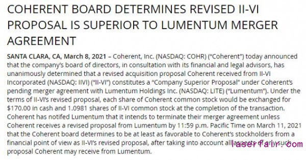 根據(jù)II-VI修訂提案的條款,在交易完成時,每股Coherent普通股將交換為170美元現(xiàn)金和1.0981股II-VI普通股。Coherent已通知Lumentum打算終止其合并協(xié)議,除非Coherent在太平洋時間2021年3月11日下午11:59之前收到Lumentum的修訂提案,且Coherent董事會認為該修訂提案從財務(wù)角度來看至少與II-VI修訂提案一樣對Coherent股東有利。