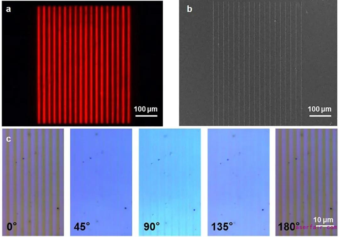 通過改變激光寫入的參數(shù),研究者制作了周期為4 μm的熒光光柵。如圖2所示,所得的光柵具有均勻且周期性的結構,且表現(xiàn)出顯著的偏振調(diào)制特性。