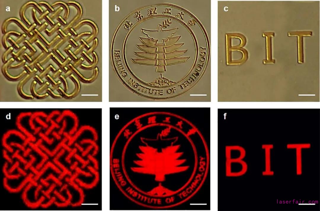 此外,為了證明該技術的普適性,研究人員展示了更加復雜圖案的制備。圖3顯示了使用OLYMPUS MX51光學顯微鏡在白光(圖3a–c)和UV-365 nm光照(圖3d–f)下制作的圖案化鈣鈦礦量子點的光學圖像。