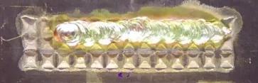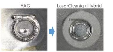 電池注液完成后需要馬上激光焊接密封,但是注液殘留在焊接區(qū)域,會造成焊接不良的問題。同樣使用相同的納秒激光器,預(yù)先對注液口周圍進(jìn)行激光清洗,然后馬上進(jìn)行復(fù)合激光焊接,能夠得到鱗狀的焊縫和平整光滑的外觀。另外,鋁的導(dǎo)熱率很高,如果熔融鋁內(nèi)部有微小氣孔的話,氣體溢出后會很快凝固,不會形成這樣的類似鏡面外觀。