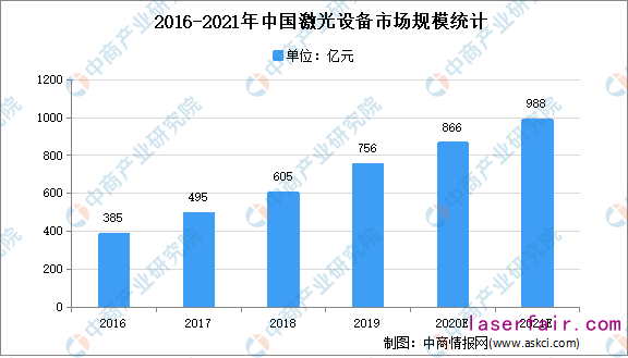 目前,我國已成為全球制造業(yè)第一大國,國內(nèi)市場對激光技術(shù)產(chǎn)品的需求日益旺盛。2010年以來,得益于激光加工應(yīng)用市場的不斷拓展,我國激光產(chǎn)業(yè)也逐漸駛?cè)敫咚侔l(fā)展期。2018年中國激光設(shè)備市場規(guī)模達到605億元,同比增長22.22%,2011年至2018年復(fù)合增速達26.45%。中商產(chǎn)業(yè)研究院預(yù)測,2021年我國激光設(shè)備市場規(guī)模將達988億元。