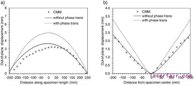 關(guān)于變形的模擬結(jié)果如圖5.5所示。平面失真關(guān)于焊縫中心線(xiàn)對(duì)稱(chēng),在焊接開(kāi)始和結(jié)束位置處接近零,在樣品長(zhǎng)度中間的外邊緣上最大。模擬角位移略大于來(lái)自CMM測(cè)量的實(shí)驗(yàn)結(jié)果,而模擬的翹曲位移在靠近板的邊緣處較小,并且朝向中心較大。