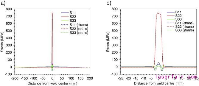 圖5.4[16] 殘余應(yīng)力分布:(a)在所有三個(gè)主要方向上,在焊縫附近的整個(gè)寬度上,(b)橫向(11),縱向(22)和具有及不具有相變的法線(xiàn)方向