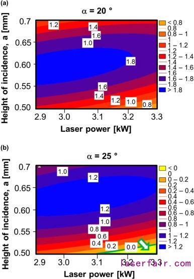 Nikolai Kashaev[15]等人對(duì)Ti-6Al-4V對(duì)接接頭和T接頭進(jìn)行Nd:YAG單面激光焊接工藝進(jìn)行了研究,使用合金兼容的填充焊絲來(lái)避免底部填充和咬邊。他們使用二次回歸建立了“非焊接皮”寬度與激光功率、入射角和入射高度的關(guān)系,通過(guò)合理的參數(shù)優(yōu)化,獲得了具有低孔隙率和適當(dāng)幾何形狀的焊縫。優(yōu)化結(jié)果如圖2.2所示。