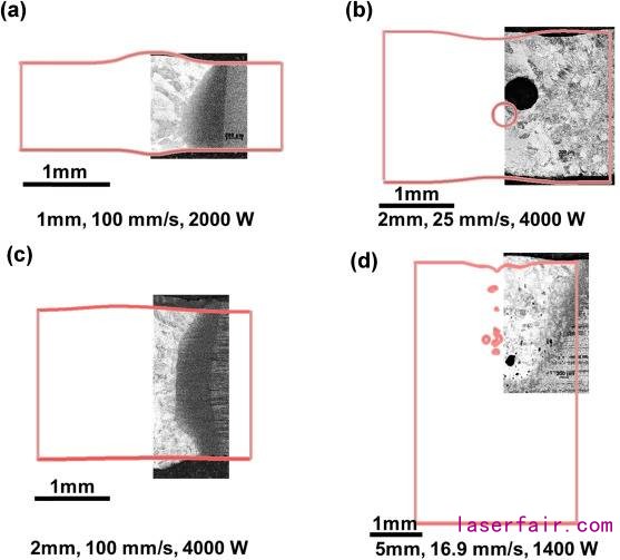 為了獲得可接受的焊接輪廓和令人滿(mǎn)意的機(jī)械性能,焊縫形狀的控制是必要的,因?yàn)楹缚p的機(jī)械性能受焊縫形狀的影響。影響焊接金屬凝固行為的焊縫形狀受焊接參數(shù)和輸入工件的相應(yīng)熱量[11]的影響。因此,有必要理解包括激光功率,焊接速度和散焦距離[12]在內(nèi)的焊接參數(shù)對(duì)焊縫形態(tài)的影響以及確定焊接缺陷的來(lái)源。然后可以確定焊接參數(shù)的最佳組合,確保所需的焊接質(zhì)量和性能,并且最小化焊接缺陷[13]。