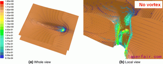 Baohua Chang[22]等人針對(duì)Ti-6Al-4V的全熔透激光焊接開(kāi)發(fā)了計(jì)算流體力學(xué)模型。并用基于對(duì)熔池中的匙孔行為和流體流動(dòng)特性的預(yù)測(cè)來(lái)分析孔的形成機(jī)理。模擬結(jié)果表明,當(dāng)使用給定的激光束聚焦光學(xué)器件焊接3mm厚的鈦合金板時(shí),在形成深熔透匙孔之前,匙孔深度振蕩,但是不能模擬預(yù)測(cè)之后的匙孔塌陷。對(duì)于較低功率,較低速度的焊接,匙孔后面的流體流動(dòng)是湍流和不穩(wěn)定的,并且形成渦流。預(yù)測(cè)熔融金屬?gòu)娜鄢氐闹行拿媪髯?,并且在熔池中,匙孔的后面留下間隙或空隙。對(duì)于較高功率,較高速度的焊接,流體流動(dòng)并不湍急,不形成這種渦流。模擬預(yù)測(cè)的工件表面處的流體流速如圖5.3。