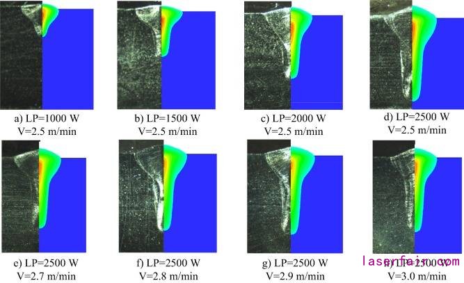 隨著焊接速度的增加,溫度下降,并預(yù)測(cè)在較小的溫度下,熔池有較小的寬度。熔池的寬度隨焊接速度的增加而降低,且模擬結(jié)果與實(shí)驗(yàn)一致。熔池的深度隨著焊接速度的增加而降低。在功率恒定的情況下,焊接速度的增加導(dǎo)致加熱時(shí)間過(guò)短,不足以產(chǎn)生顯著的熔池深度。在高焊接速度下,模擬結(jié)果與實(shí)驗(yàn)數(shù)據(jù)一致。由于在較低速度下,光束在匙孔內(nèi)多次反射,吸收率增加,模擬略微不同于實(shí)驗(yàn)。熱影響區(qū)隨著焊接速度的增加而減小。