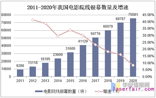 根據(jù)國家電影專資辦發(fā)布的《2020年度中國電影市場數(shù)據(jù)報告》數(shù)據(jù)顯示,2020年,中國電影總票房達到204.17億元,因疫情影響比上年減少68.23%,但首次票房位居全球市場第一,其中2020年新增銀幕5794塊,全國銀幕總數(shù)達到75581塊。