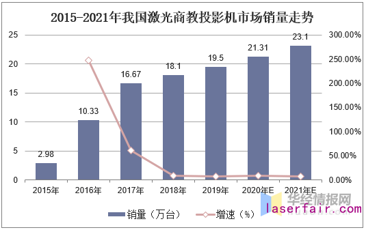 在激光教育投影機市場,據(jù)統(tǒng)計,截至2019年我國激光商教投影機市場銷量為19.5萬臺,同比增長7.7%,預計2021年銷量為23.1萬臺。