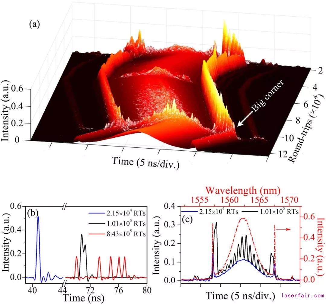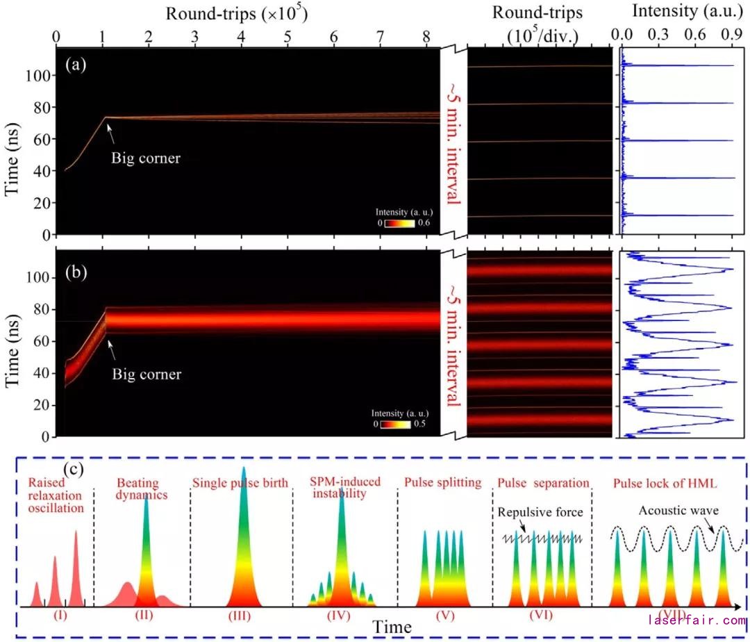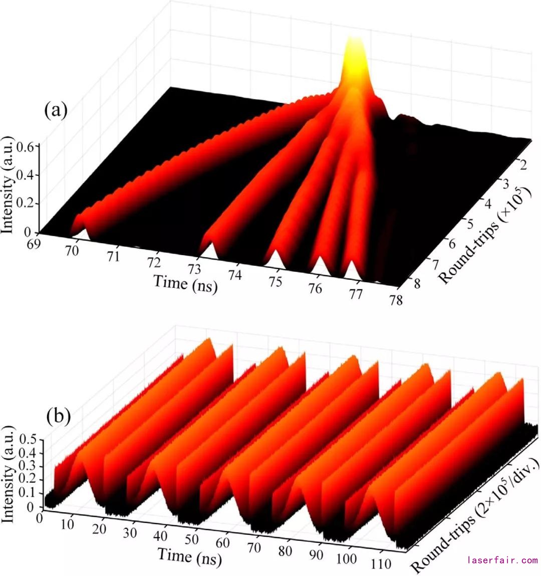 當(dāng)泵浦功率提高到較高水平時(shí),光纖激光器在腔內(nèi)可以產(chǎn)生多個(gè)光脈沖。這些多脈沖是由噪聲種子調(diào)制不穩(wěn)定性產(chǎn)生的,這種不穩(wěn)定性會(huì)導(dǎo)致不穩(wěn)定的分裂和脈沖分裂。相鄰脈沖之間的引力會(huì)導(dǎo)致脈沖群的形成,如穩(wěn)定的束縛態(tài)、不穩(wěn)定的脈沖束甚至孤子雨。相反,它們之間的斥力通常會(huì)驅(qū)使脈沖彼此遠(yuǎn)離,從而導(dǎo)致整個(gè)腔中的脈沖分布不均勻或不均勻。被動(dòng)鎖模激光器中產(chǎn)生的諧波鎖模歸因于脈沖通過聲波效應(yīng)、腔中輻射的非孤子分量(即色散波或連續(xù)波)以及增益損耗和恢復(fù)機(jī)制引起的脈沖長程相互作用。被動(dòng)諧波鎖模現(xiàn)象已在鎖模激光器的各種理論和實(shí)驗(yàn)結(jié)構(gòu)中得到證實(shí),1993年報(bào)道了285次諧波的諧波鎖模激光器。通常情況下,諧波鎖模是在最終穩(wěn)定狀態(tài)下測量的,一些理論模型是建立在現(xiàn)象學(xué)假說的基礎(chǔ)上的。Gordon和Gat提出了一個(gè)統(tǒng)計(jì)力學(xué)模型,認(rèn)為熵是鎖模理論的重要組成部分。到目前為止,被動(dòng)諧波鎖模的整個(gè)形成過程還沒有詳細(xì)的報(bào)道。諧波鎖模形成過程的起源尚不清楚,也沒有令人滿意的理論描述來揭示諧波鎖模運(yùn)行的內(nèi)在機(jī)制。