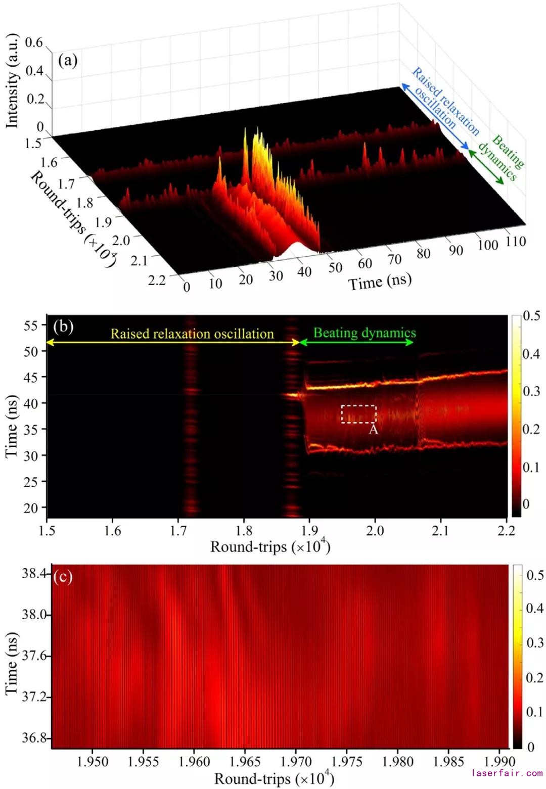 圖3 通過時(shí)間拉伸色散傅里葉變換技術(shù)捕獲諧波鎖模建立的早期階段,對(duì)應(yīng)于 1.5×104 到 2.2×104 個(gè)往返數(shù)。 注意,只有噪聲背景出現(xiàn)在 1.5×104 往返數(shù)之前。 (a) 強(qiáng)度分布 (z 軸)隨腔內(nèi)時(shí)間( x 軸)和往返數(shù)( y 軸)的變化而變化。被動(dòng)諧波鎖模的發(fā)生包括升高的弛豫振蕩和拍頻動(dòng)力學(xué)。在上升弛豫振蕩過程中有兩個(gè)激光尖峰,每個(gè)激光尖峰包含大量的脈沖。( b) (a) 的俯視圖。( c) (b) 的 A 區(qū)數(shù)據(jù)的特寫,揭示了拍動(dòng)動(dòng)力學(xué)的干涉圖樣。