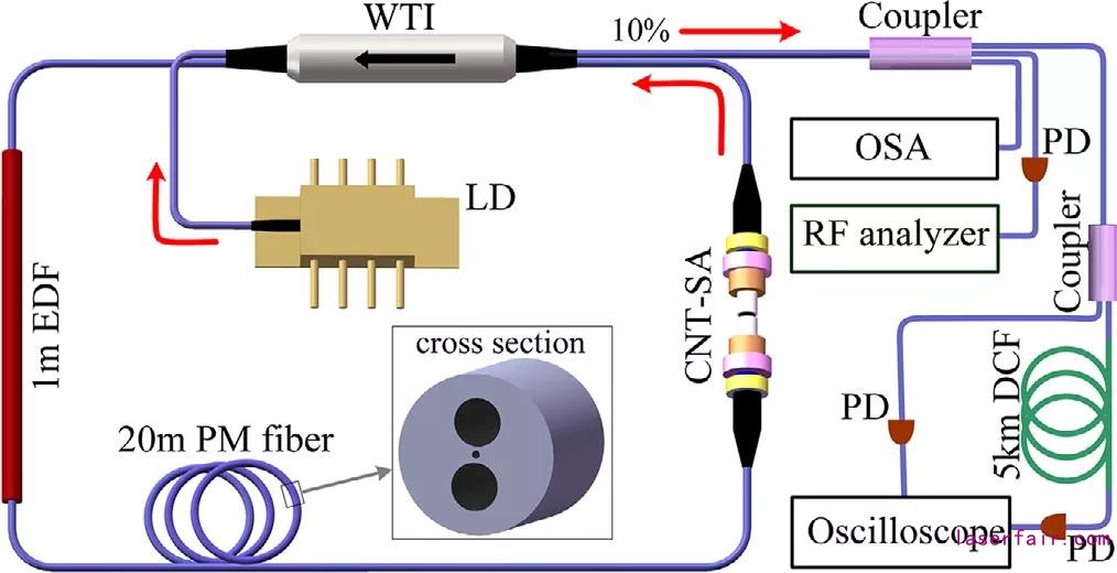 圖1 鎖模激光器實(shí)驗(yàn)裝置示意圖(左側(cè))及其超快特性線(右側(cè))。 定時(shí)數(shù)據(jù)和實(shí)時(shí)光譜數(shù)據(jù)分別通過直接檢測和檢測前在 5 km 色散補(bǔ)償光纖 (DCF) 中色散實(shí)現(xiàn)。插圖:保偏光纖的橫截面。 EDF ,摻鉺光纖; LD ,激光二極管; CNT-SA ,碳納米管可飽和吸收體; WTI ,波分復(fù)用器、抽頭耦合器和隔離器的混合組合器; OSA ,光譜分析儀; RF ,射頻; PD ,光電探測器。