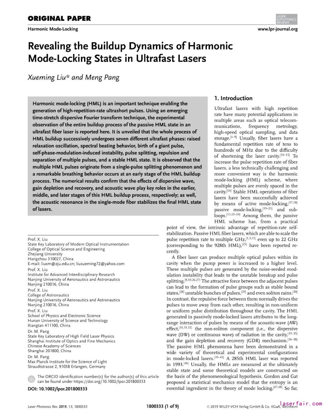 Xue-Ming Liu and Meng Pang, Revealing the Buildup Dynamics of Harmonic Mode‐Locking States in Ultrafast Lasers, Laser & Photonics Reviews 13(9): 1800333 (2019).
