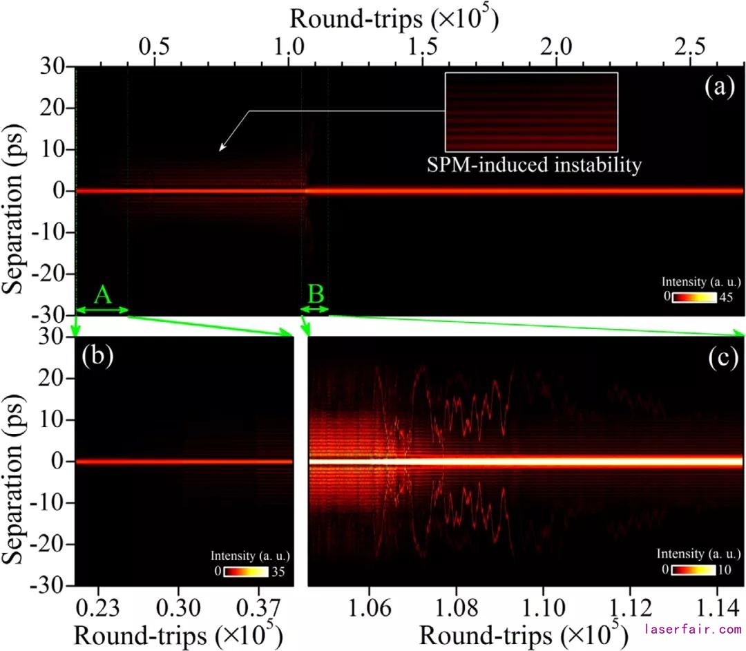 圖5a說明了圖2b中每個(gè)單激發(fā)光譜的傅里葉變換,對(duì)應(yīng)于瞬時(shí)脈沖的自相關(guān),其跟蹤脈沖之間時(shí)間間隔的演變。圖5b和5c分別是圖5a中A和B區(qū)域的放大圖。圖5b揭示了從大約0.2×105到0.3×105腔往返的腔中只存在單個(gè)脈沖(例如,圖4b,c中藍(lán)色曲線),隨后,自相位調(diào)制引起較弱的調(diào)制不穩(wěn)定性。自相位調(diào)制引起的不穩(wěn)定性逐漸增加,直到1.06×105 腔往返(圖4b,c中黑色曲線),最終導(dǎo)致脈沖分裂,產(chǎn)生五個(gè)脈沖,如圖5c所示。圖5c顯示,從1.06×105至1.13×105 腔往返開始的過程中產(chǎn)生了多個(gè)脈沖,對(duì)應(yīng)于大轉(zhuǎn)角附近的區(qū)域(圖2和4)。從0.3×105到1.06×105腔往返開始記錄的自相位調(diào)制引起的不穩(wěn)定性是產(chǎn)生多個(gè)腔內(nèi)脈沖的關(guān)鍵階段。圖5a顯示了多個(gè)脈沖在1.13×105腔往返以上區(qū)域的演化軌跡與單脈沖在0.2×105至0.3× 105腔往返范圍內(nèi)的演化軌跡相似。