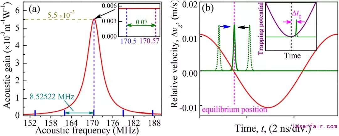 圖7 聲學(xué)共振和光機(jī)效應(yīng)對(duì)諧波鎖模鎖定和穩(wěn)定的貢獻(xiàn)。(a) 聲增益譜(紅色曲線)用于單模光纖中的第四個(gè)聲學(xué)模式(R04)。第二、第四和第五階諧波鎖模的整數(shù)倍重復(fù)率為170.5 MHz,對(duì)應(yīng)于從170.57 MHz處的增益峰值頻率偏移0.07 MHz。插圖顯示了聲學(xué)增益峰值區(qū)域的特寫。(b) 相對(duì)速度(紅色曲線)由模式R04的聲學(xué)振動(dòng)引起,將脈沖鎖定在平衡位置。插圖顯示了由于“彈簧”效應(yīng)而產(chǎn)生的陷阱電位。