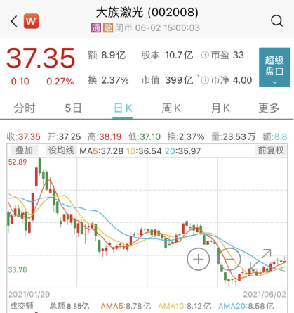 截至6月2日收盤(pán),大族激光股價(jià)漲0.27%, 報(bào)37.35元/股。