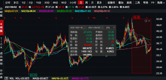 但超預(yù)期的業(yè)績(jī)表現(xiàn)并未助力股價(jià)。今年2月18日,大族激光股價(jià)創(chuàng)出3年以來(lái)高點(diǎn)52.89元/股,之后出現(xiàn)調(diào)整,近3個(gè)多月來(lái),股價(jià)累計(jì)跌幅近30%。