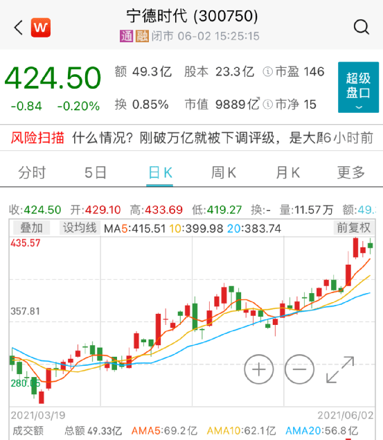 寧德時(shí)代借鋰電池行業(yè)發(fā)展的東風(fēng),上市三年來(lái)股價(jià)漲逾13倍。5月31日,寧德時(shí)代突破萬(wàn)億市值大關(guān)。這兩日股價(jià)出現(xiàn)回調(diào),截至6月2日,寧德時(shí)代跌0.2%,報(bào)424.50元/股,最新市值9889億。