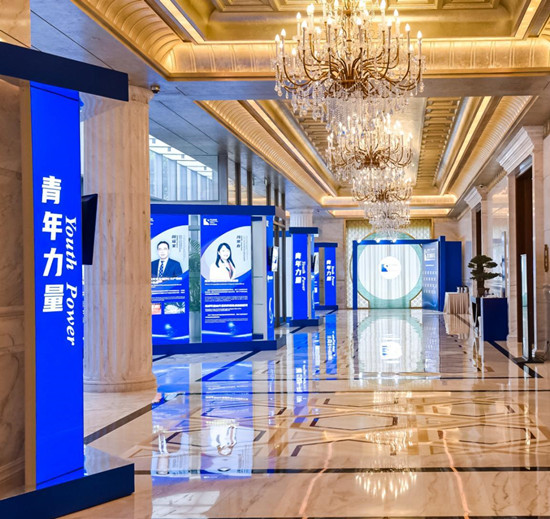 2021浦江創(chuàng)新論壇主會(huì)場(chǎng),以“青年力量”為主題的照片墻,展示十幾位青年科學(xué)家的照片及他們的科研成就。