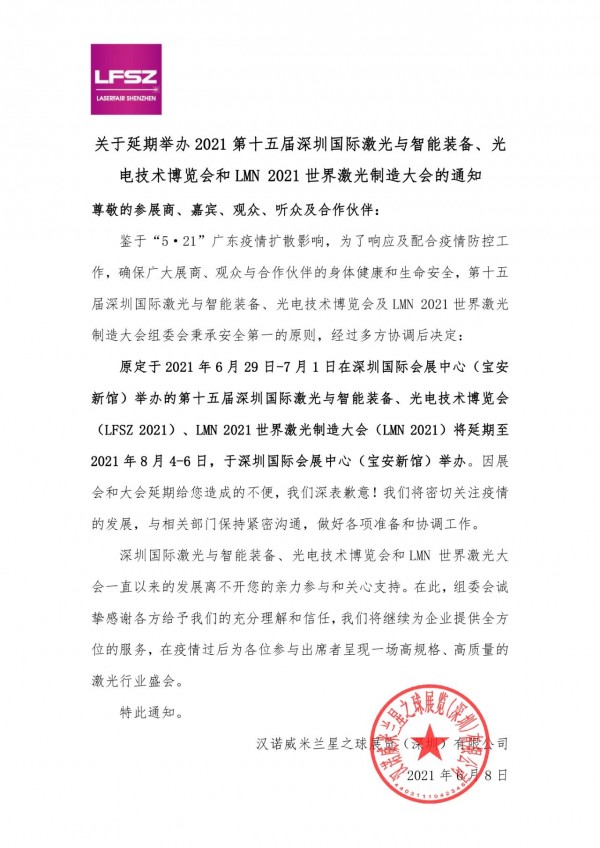 同時,受疫情影響,原定于2021年6月29日-7月1日在深圳國際會展中心(寶安新館)舉辦的第十五屆深圳國際激光與智能裝備、光電技術(shù)博覽會(LFSZ 2021)、LMN 2021世界激光制造大會(LMN 2021)將延期至2021年8月4-6日,于深圳國際會展中心(寶安新館)舉辦。