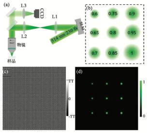 為了提高加工效率以及激光能量利用率,這里使用德國(guó)HOLOEYE反射式的液晶相位調(diào)制器(LETO-VIS-009)作為空間光場(chǎng)調(diào)制的手段?;贚C-SLM的并行飛秒激光加工系統(tǒng)如圖 2(a)所示,波長(zhǎng)為514 nm,脈寬為230 fs的飛秒激光經(jīng)過(guò)LC-SLM進(jìn)行空間光場(chǎng)調(diào)制后,利用4f光路將調(diào)制之后的光場(chǎng)相位分布投影到物鏡入瞳,經(jīng)過(guò)物鏡之后,在物鏡焦平面形成多個(gè)焦點(diǎn),實(shí)現(xiàn)多點(diǎn)并行加工。為了提高飛秒激光的能量利用率,4f系統(tǒng)使用了焦距分別為400 mm和300 mm的透鏡,可以在投影的同時(shí)實(shí)現(xiàn)縮束效果,從而在充分利用物鏡數(shù)值孔徑的基礎(chǔ)上充分利用飛秒激光的能量。為了實(shí)現(xiàn)對(duì)多個(gè)焦點(diǎn)的位置和能量的準(zhǔn)確控制,并考慮到計(jì)算的速度等問(wèn)題,這里使用基于傅里葉全息的最優(yōu)旋轉(zhuǎn)角算法(Optimal Rotation Angle Algorithm, ORA),其優(yōu)勢(shì)在于僅通過(guò)正向傅里葉變換即可迭代得到較為理想的全息相位分布,且只需要較少的迭代次數(shù)。圖 2(b)是預(yù)先設(shè)計(jì)的3×3共計(jì)9個(gè)不同聚焦光點(diǎn)的能量和位置示意圖,其中點(diǎn)與點(diǎn)之間的間隔為20 μm,其相對(duì)能量數(shù)值從0.6均勻變化到1。利用ORA全息算法計(jì)算得到其相應(yīng)的全息相位分布如圖 2(c)所示,其中最大和最小數(shù)值分別對(duì)應(yīng)于-π和+π。隨后利用S-FFT衍射積分算法對(duì)計(jì)算得到的全息相位進(jìn)行光場(chǎng)仿真,并得到其在焦平面的光場(chǎng)能量分布(圖 2(d)),計(jì)算結(jié)果與設(shè)計(jì)基本保持一致,證明ORA算法可以滿足并行加工的需求。