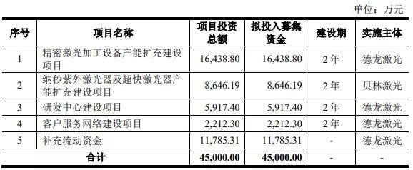 招股書顯示,德龍激光此次IPO擬募資4.5億元,投建于精密激光加工設(shè)備產(chǎn)能擴(kuò)充建設(shè)項目、納秒紫外激光器及超快激光器產(chǎn)能擴(kuò)充建設(shè)項目、研發(fā)中心建設(shè)項目、客戶服務(wù)網(wǎng)絡(luò)建設(shè)項目以及補(bǔ)充流動資金。