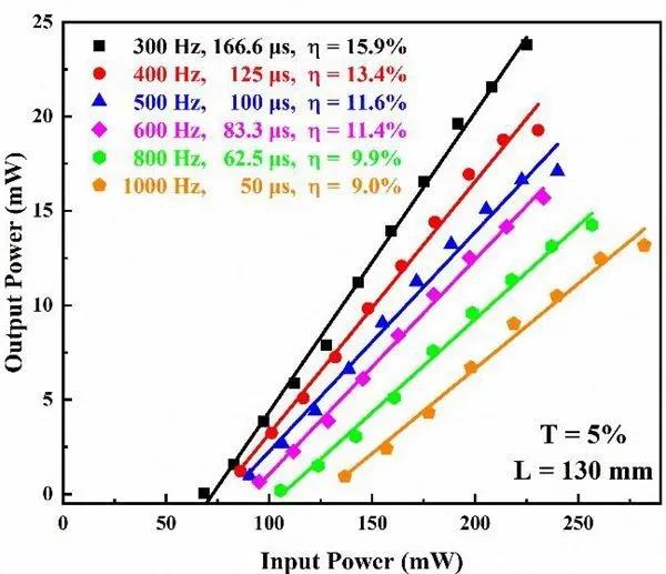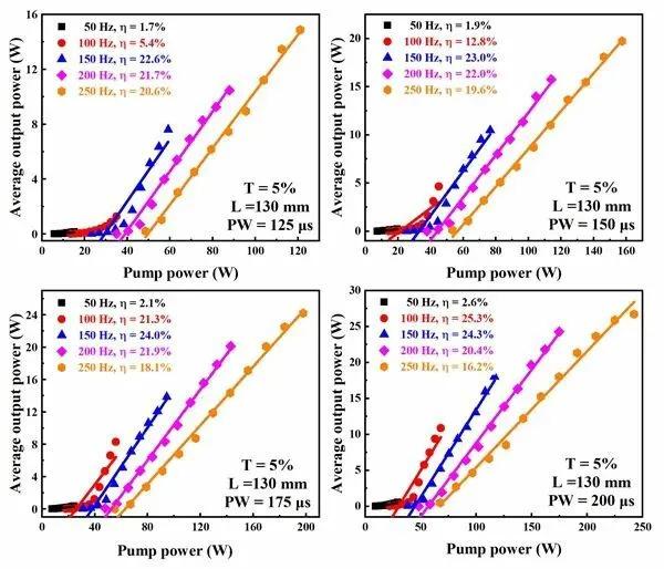 圖2 不同工作頻率和泵浦脈沖寬度條件下,LD側(cè)泵浦Er:YAP晶體的平均輸出功率與泵浦功率的關(guān)系