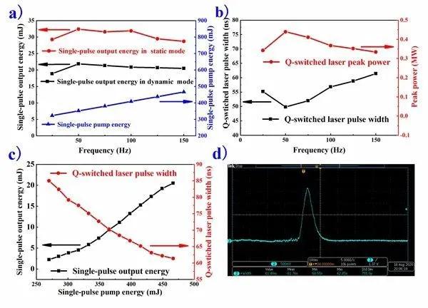 (a)單脈沖輸出能量(動態(tài)和靜態(tài)模式)和泵浦能量隨工作頻率的變化;