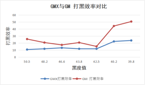 GMX與GM在打黑黑度相同情況下,進(jìn)行打黑效率對比,見下圖5,GMX打黑效率比GM有明顯優(yōu)勢。