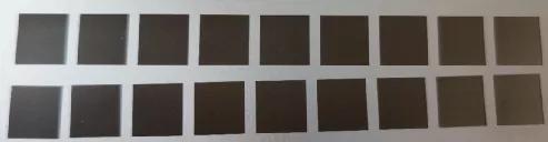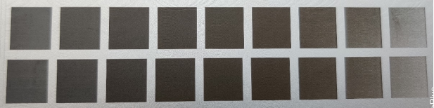 圖2及圖3分別是GMX和GM在填充密度相同情況下,分別采用2組小脈寬,速度以500mm/s的梯度進(jìn)行遞增,進(jìn)行的打黑效果對比,GMX打黑參數(shù)區(qū)域更廣、更黑。