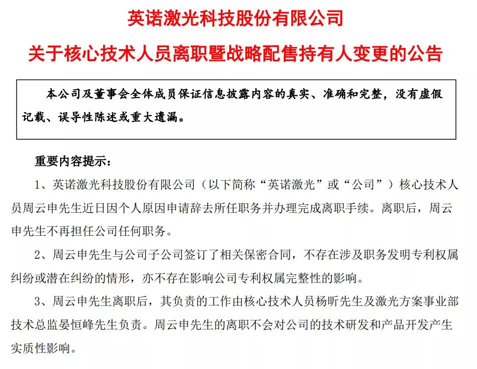 英諾激光:核心技術(shù)人員周云申申請辭去激光應(yīng)用技術(shù)研發(fā)工程師、高級科學(xué)家職務(wù)
