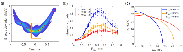 圖2 二極磁鐵中激光-束流相互作用的實(shí)驗(yàn)表征。(a)與激光相互作用后電子束的縱向相空間,紅色虛線代表電子束的中心能量,橙色框中包含了因相互作用而改變的區(qū)域;(b)在不同的激光脈沖能量下,電子束通過第一個(gè)色散段后測(cè)量到的相干輻射強(qiáng)度及相應(yīng)的擬合曲線;(c)使用相干輻射產(chǎn)生方法來計(jì)算能量調(diào)制幅度及電子束團(tuán)的切片能散