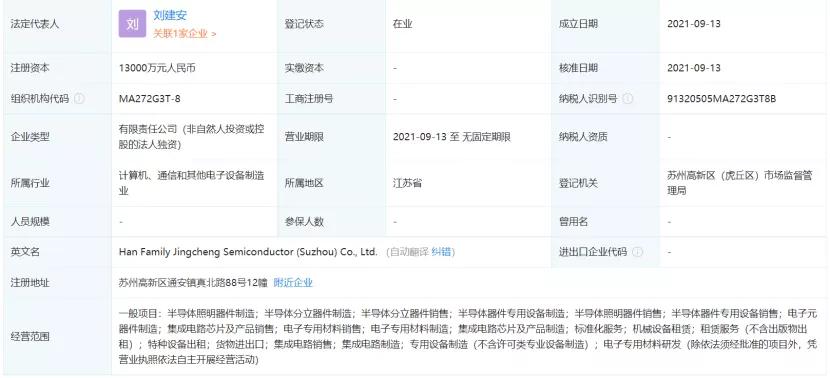 9月13日,大族精誠半導體(蘇州)有限公司成立,法定代表人為劉建安,注冊資本1.3億元人民幣,經(jīng)營范圍包含:半導體器件專用設備制造;集成電路芯片及產(chǎn)品制造;電子專...