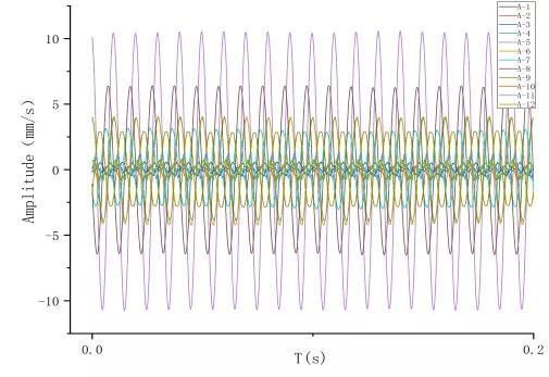 從各點的時域信號可以看出,各點的振動呈周期性穩(wěn)態(tài)特性,通過頻譜圖可以看出,振動頻率主要集中在100Hz及其諧波分量。進一步地,基于采集的各點時域信號,可以對電抗器進行振動有效值分析和振動分布情況等相關(guān)分析。