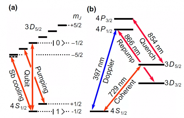 圖2:基于Ca40離子的光學(xué)量子比特方案。S1/2態(tài)到P1/2態(tài)的電偶極躍遷用于多普勒冷卻和熒光探測(cè),S1/2態(tài)到D5/2態(tài)的電四極躍遷用于離子的邊帶冷卻、初態(tài)制備和相干操作。相干操作所需的729nm激光需要具備Hz量級(jí)的激光線寬。