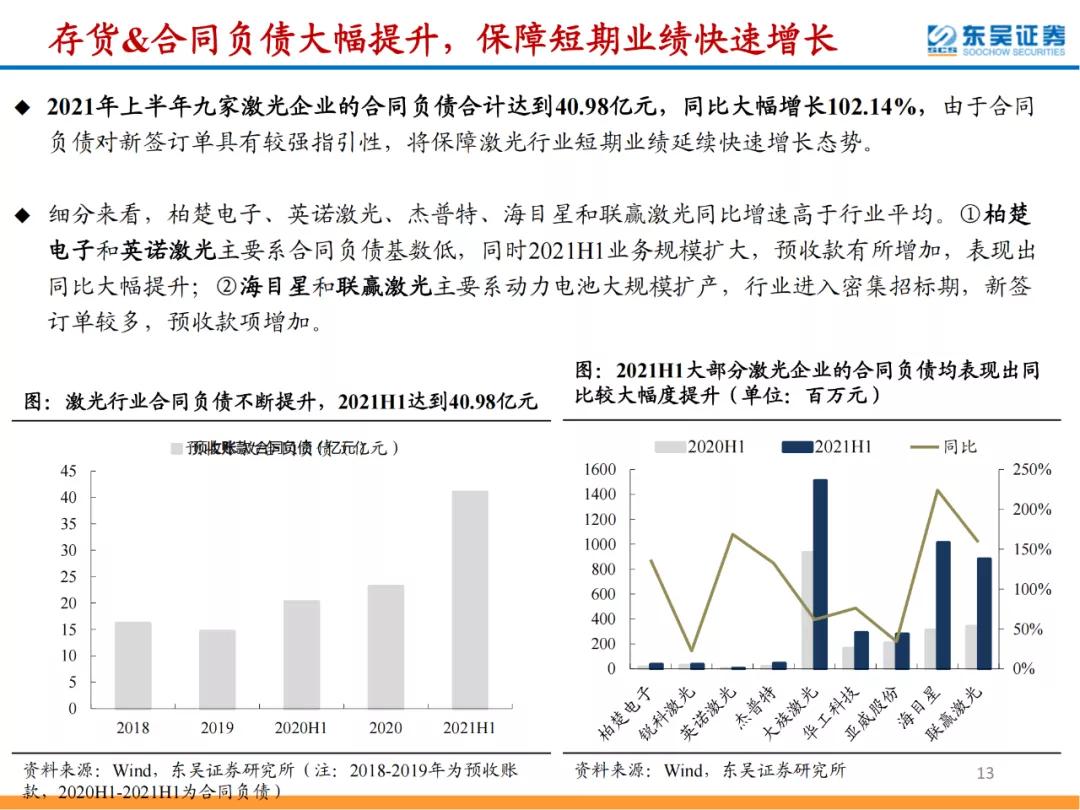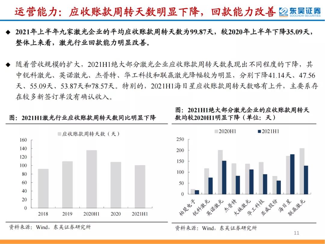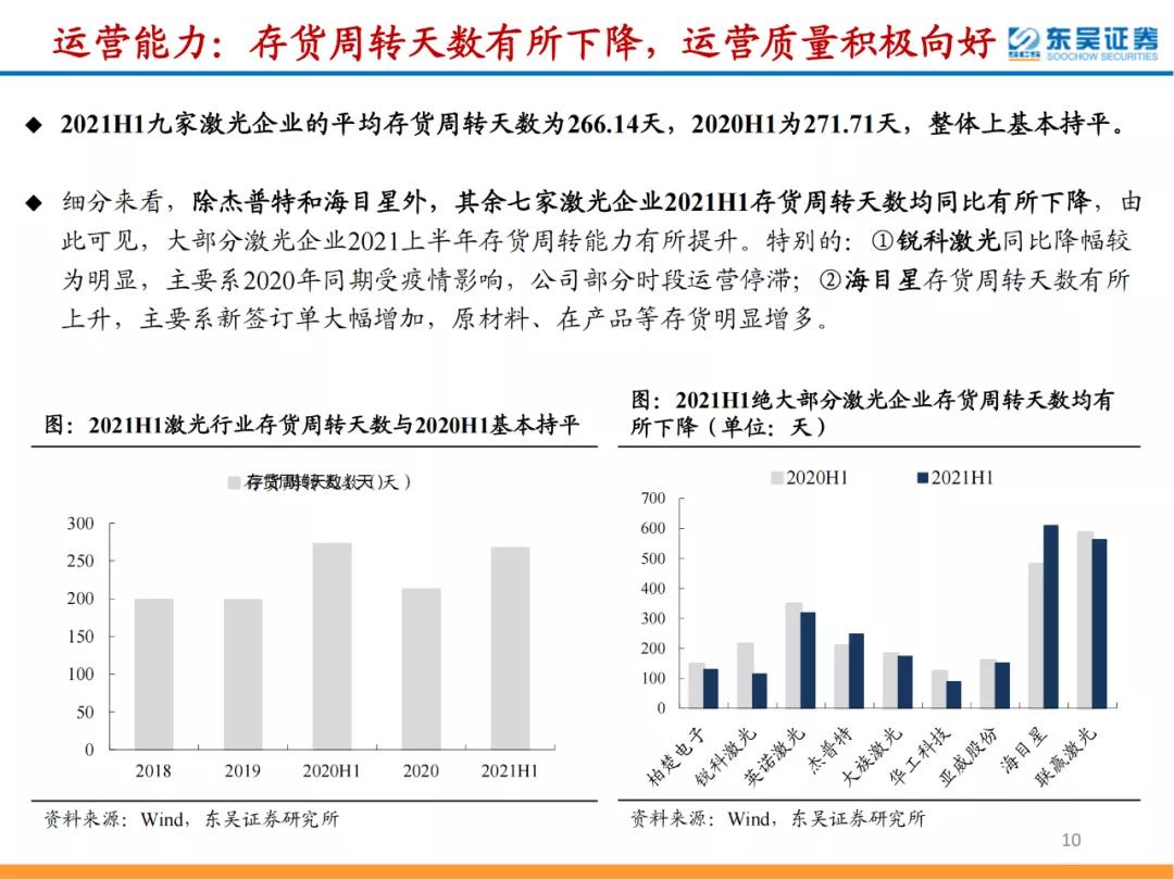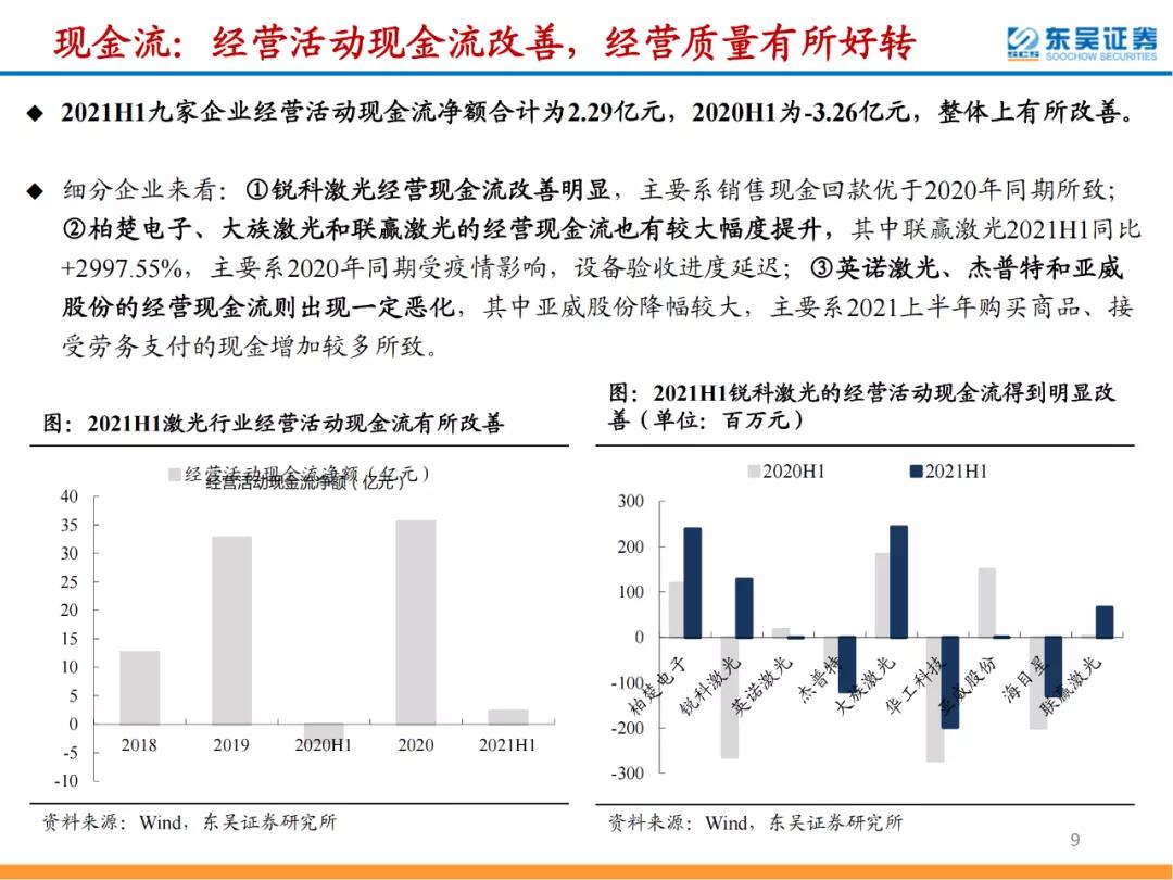 整體來(lái)看,2021H1九家激光企業(yè)合計(jì)實(shí)現(xiàn)營(yíng)收170.90億元,同比+57.29%,合計(jì)實(shí)現(xiàn)歸母凈利潤(rùn)20.33億元,同比+53.96%,業(yè)績(jī)保持高速增長(zhǎng);綜合凈利率為12.08%,同比-0.10pct,表現(xiàn)較為穩(wěn)定;綜合毛利率為32.11%,同比-2.71pct,出現(xiàn)一定回落;綜合期間費(fèi)用率為19.48%,同比-3.34pct,規(guī)模效應(yīng)顯現(xiàn);此外,經(jīng)營(yíng)現(xiàn)金流和營(yíng)運(yùn)能力等指標(biāo)積極向好,存貨&合同負(fù)債大幅提升,將保障短期業(yè)績(jī)繼續(xù)高增長(zhǎng)。