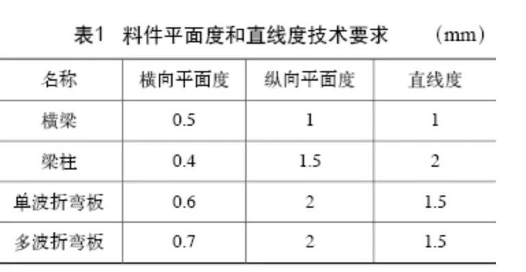 激光焊裝配精度對(duì)梁柱、波紋板等料件單件平面度、直線度技術(shù)要求見(jiàn)表1。